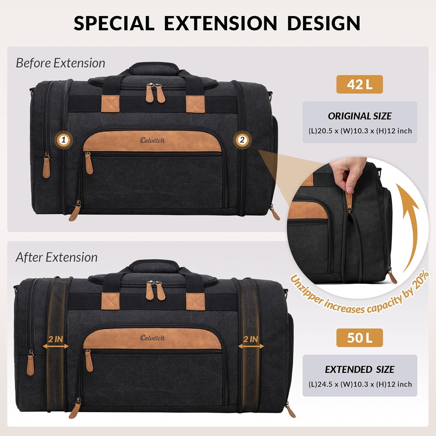 With a spacious 50-liter capacity, this duffle bag provides ample room to pack all your essentials while staying organized. The expandable feature allows you to adjust the bag’s size based on your needs, making it versatile for different travel occasions.